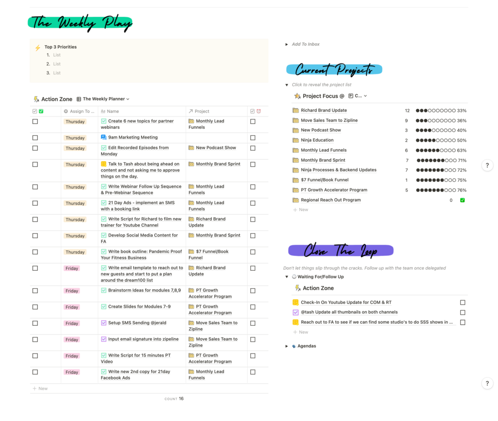 Duplicate the Focus Hub Template into your workspace and customise it for the way you work. Multiple views and modules allow you to customise it for how you want to work. It includes the three main modules: The Status Board, The Weekly Play & The Next Up View.