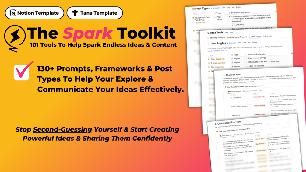 3 years ago I started collecting a few post frameworks to help me plan & write content. Those few frameworks grew into more frameworks, headlines, prompts, content angles and tools to help me explore every angle of an idea and create an amazing amount of content fast.